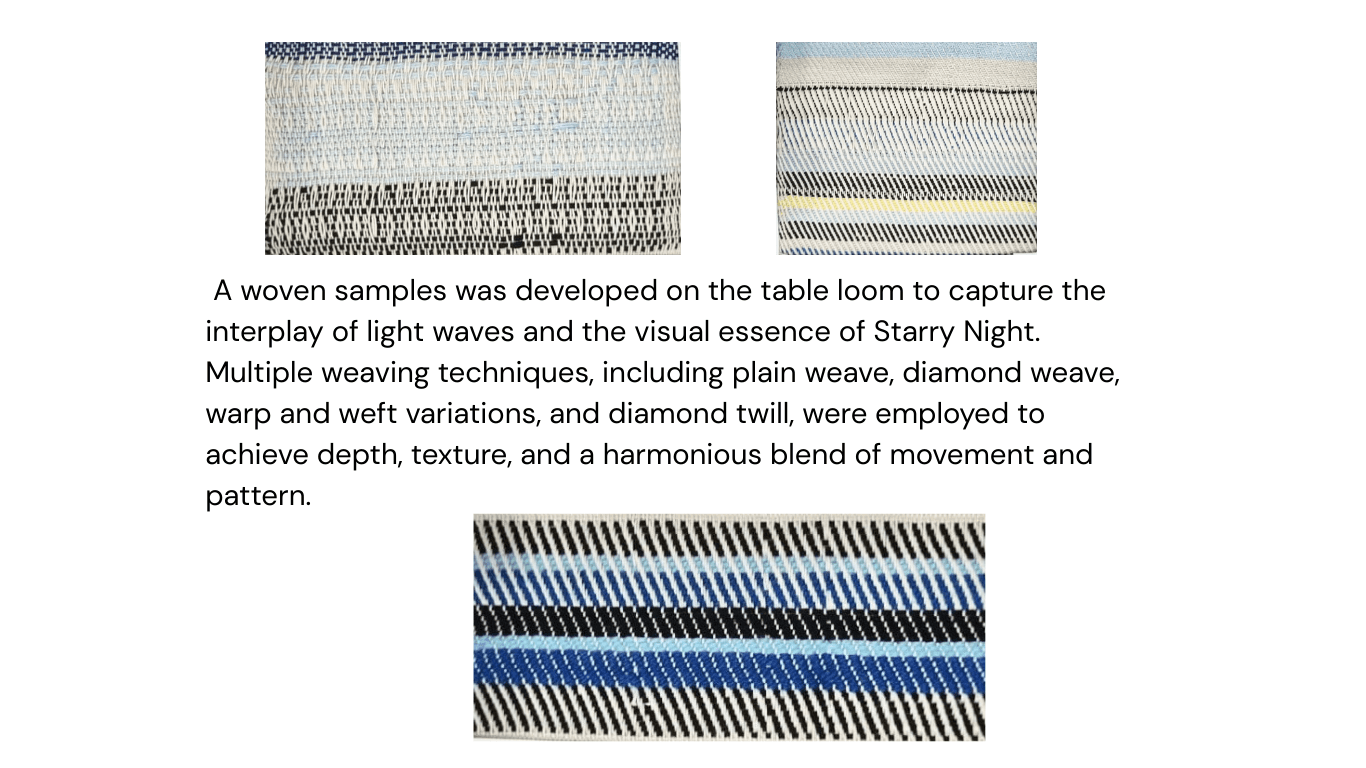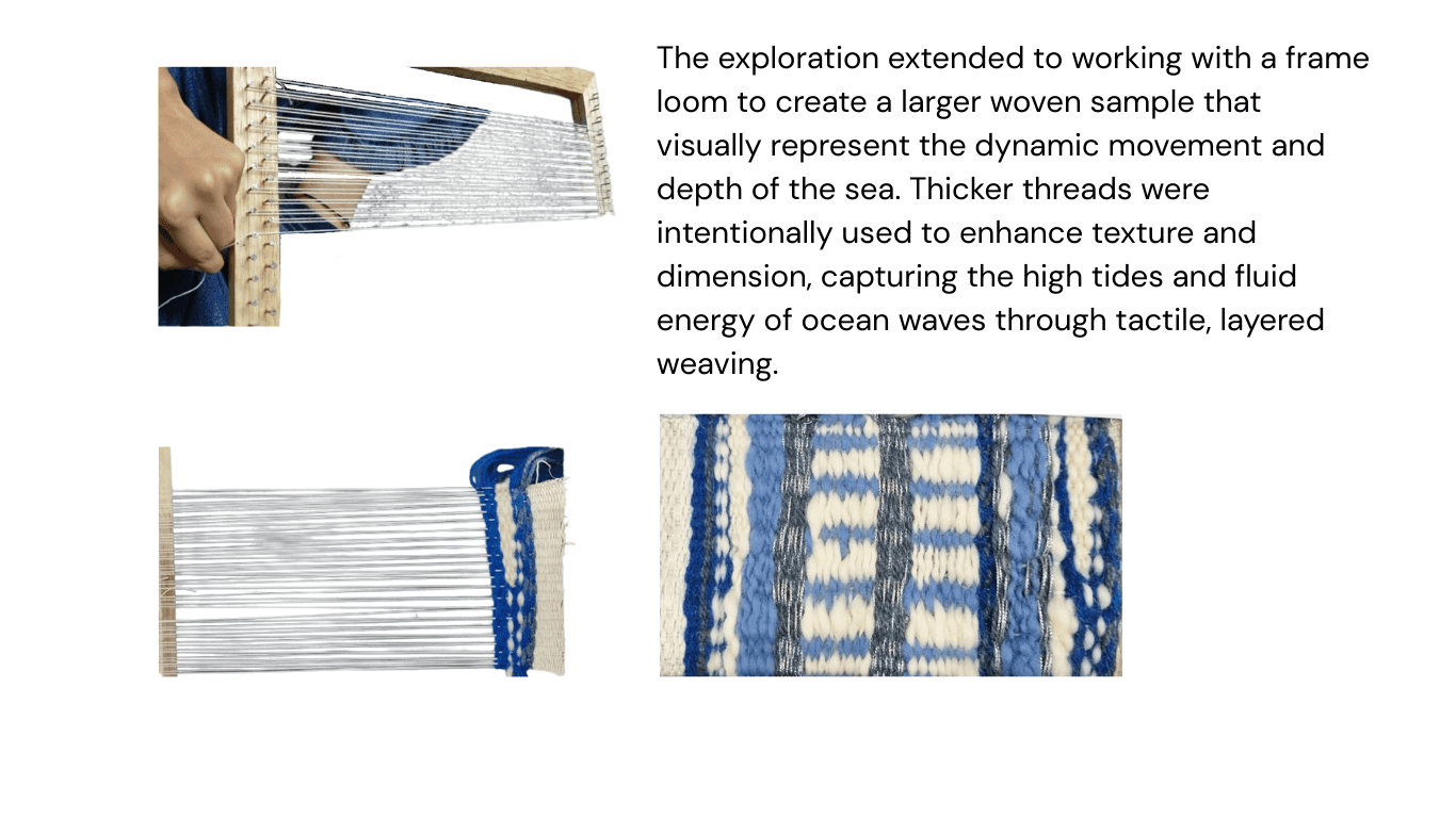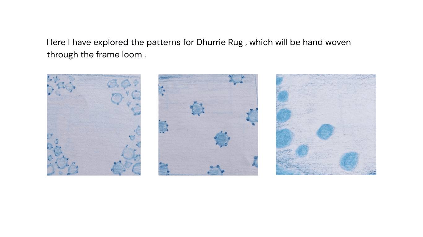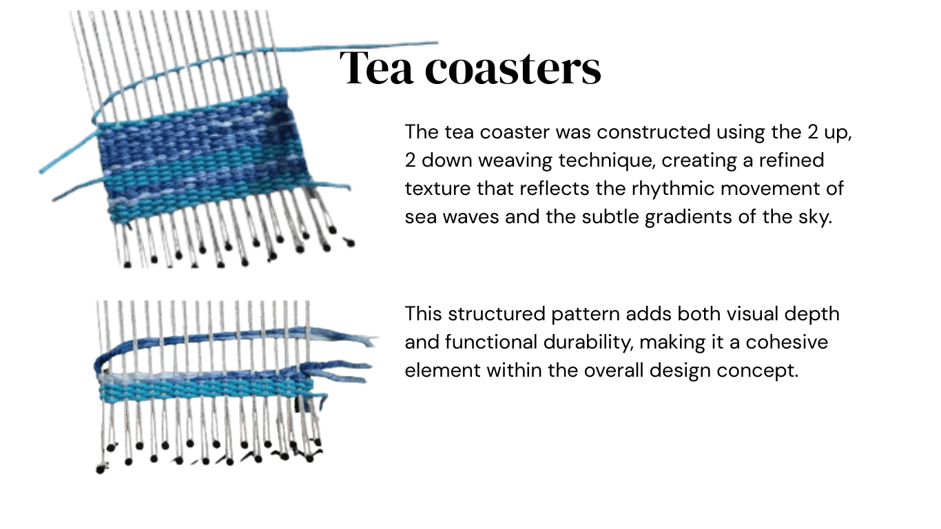 The very first was to take inspiration that you can incorporate in your designs , Then starting to learn the basic of wrap and weft how to use different kinds of loom like table loom and frame loom ,exploring the patterns of the paper drafting then learning the whole process of weaving , then explored plain weave , waft twill , weft twill , diamond twill and honey womb , them explored materials for the texture and then used the process of dyeing to get the different colors as per the inspiration , then worked with frame loom to incorporate a into bigger sample , explored fabrics and dyed them to achieve the colors and did sketches to have a different patterns to make tea coasters , rug and cushion with involved basic stitching that the project concluded.