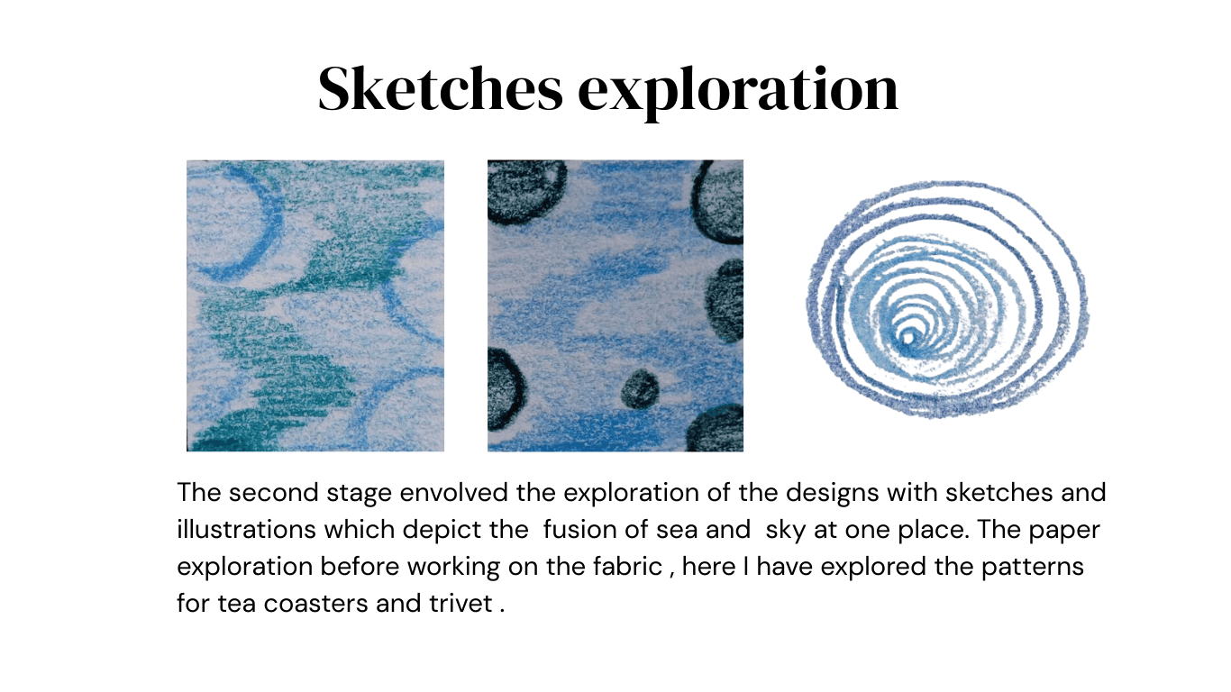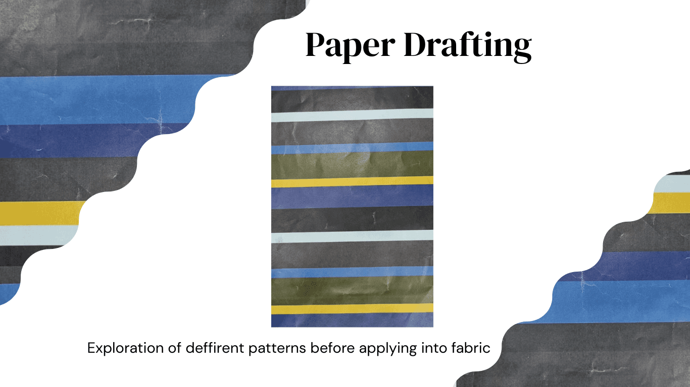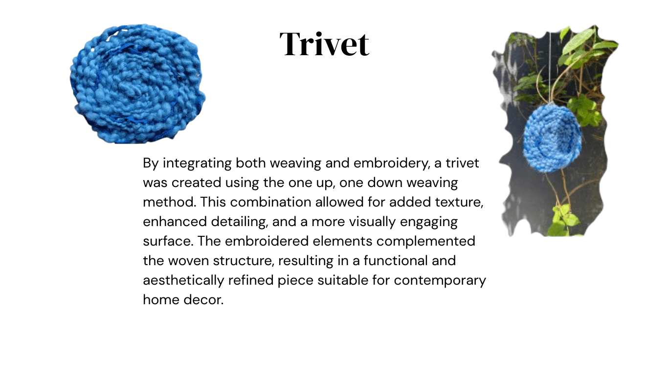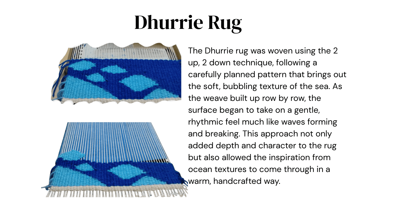 The very first was to take inspiration that you can incorporate in your designs , Then starting to learn the basic of wrap and weft how to use different kinds of loom like table loom and frame loom ,exploring the patterns of the paper drafting then learning the whole process of weaving , then explored plain weave , waft twill , weft twill , diamond twill and honey womb , them explored materials for the texture and then used the process of dyeing to get the different colors as per the inspiration , then worked with frame loom to incorporate a into bigger sample , explored fabrics and dyed them to achieve the colors and did sketches to have a different patterns to make tea coasters , rug and cushion with involved basic stitching that the project concluded.