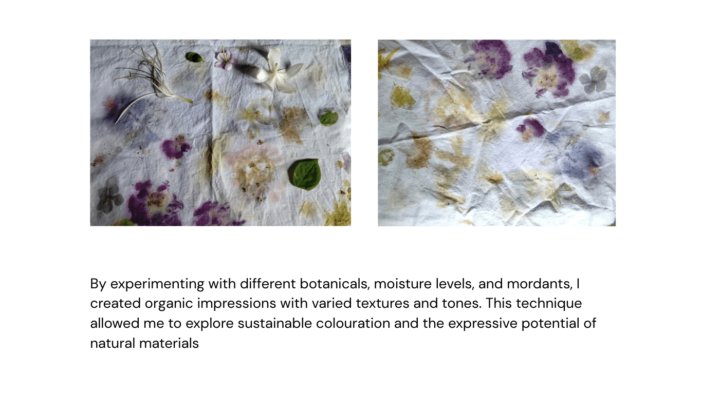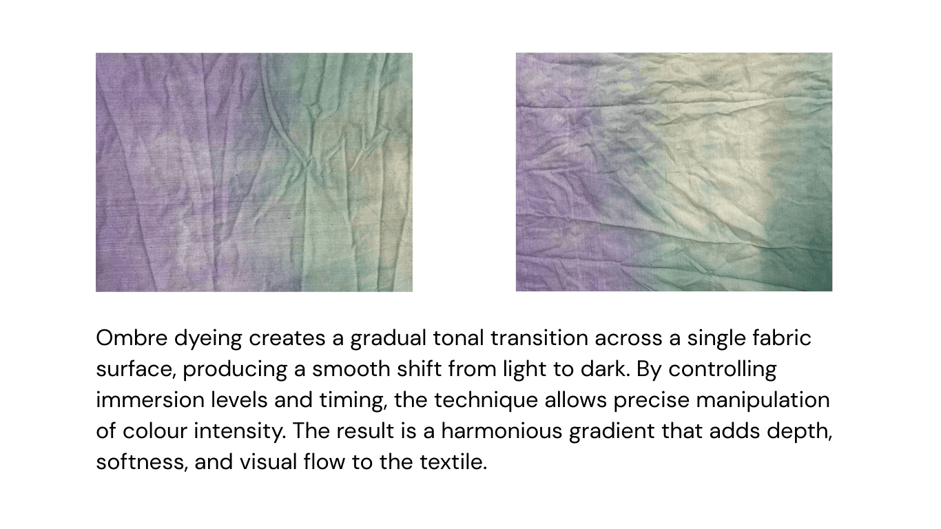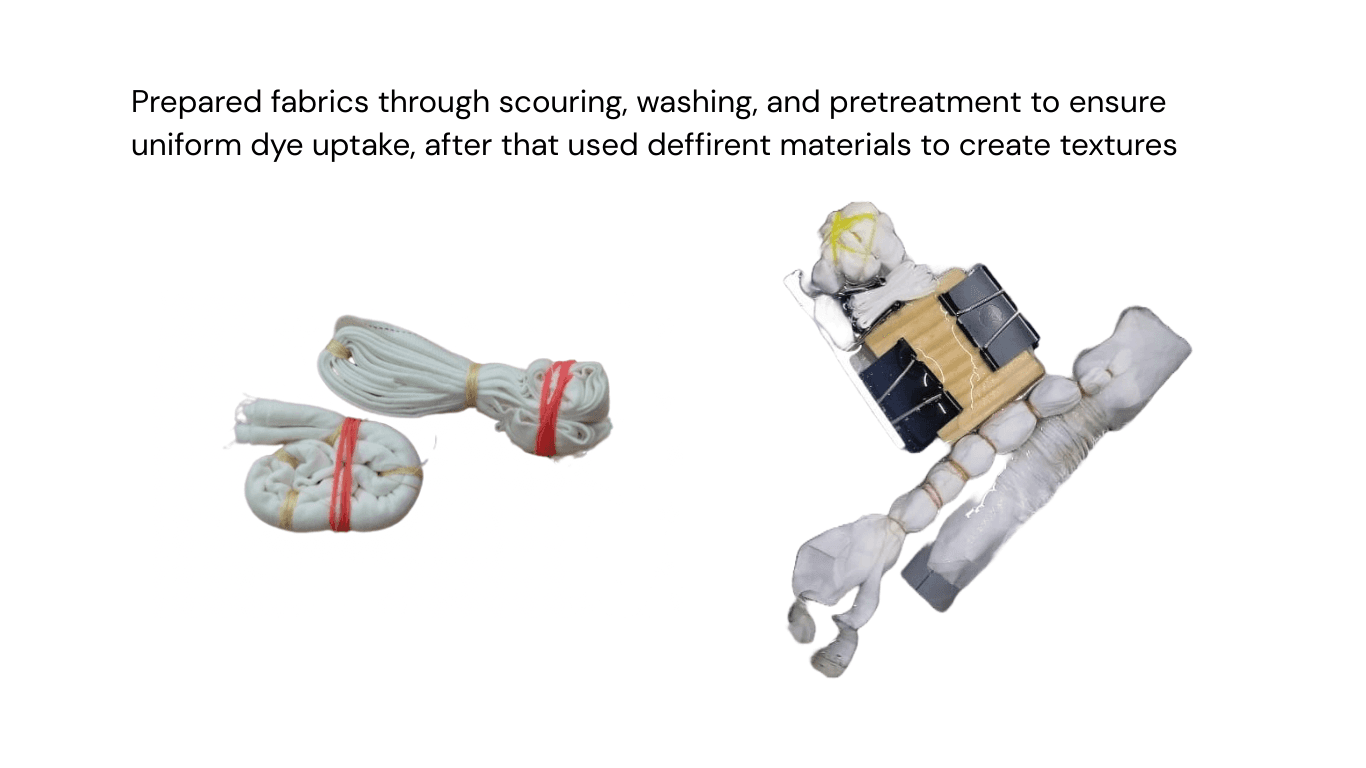 This project explores a diverse range of dyeing techniques to understand how different resist methods, heat processes, and natural colour sources influence textile surfaces. The study includes tie & dye, knot dyeing, and clamp dyeing, each revealing unique resist based pattern formations through tension, pressure, and binding. Alongside these, hot dyeing experiments investigate colour saturation and fabric absorption under heat. Complementing the chemical methods, plant based dyeing and eco printing introduce natural pigments and direct botanical impressions, creating organic textures and earthy palettes.Together, these techniques form a comprehensive exploration of material behaviour and pattern.