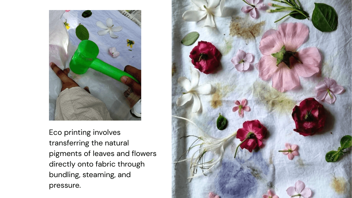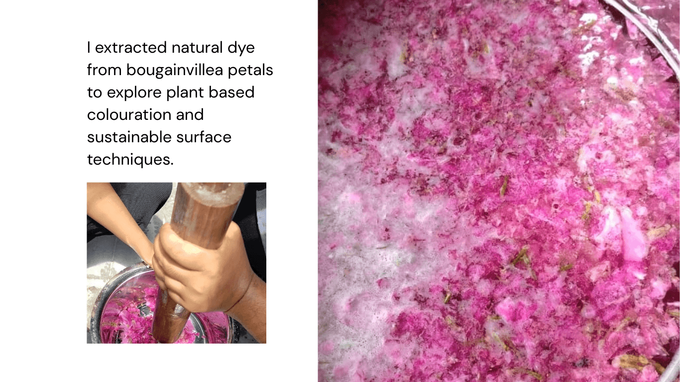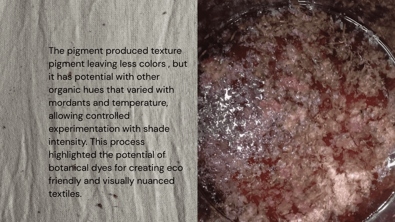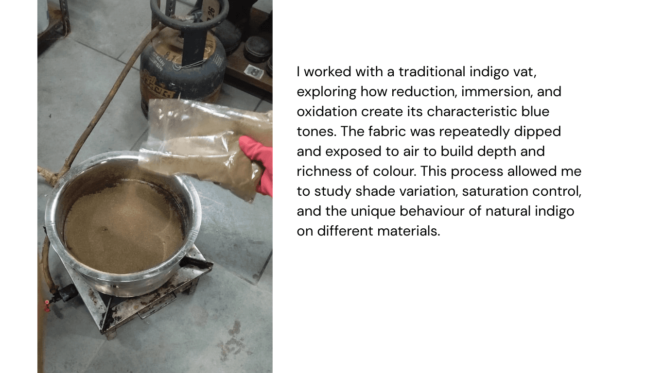 This project explores a diverse range of dyeing techniques to understand how different resist methods, heat processes, and natural colour sources influence textile surfaces. The study includes tie & dye, knot dyeing, and clamp dyeing, each revealing unique resist based pattern formations through tension, pressure, and binding. Alongside these, hot dyeing experiments investigate colour saturation and fabric absorption under heat. Complementing the chemical methods, plant based dyeing and eco printing introduce natural pigments and direct botanical impressions, creating organic textures and earthy palettes.Together, these techniques form a comprehensive exploration of material behaviour and pattern.